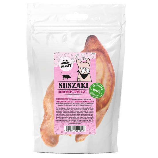 Compozitie: 1100% ureche de porc deshidratata. Proteine: 45%, Grasime 15%, Fibre 9%, Cenusa 2.7%, Umiditate 12%.